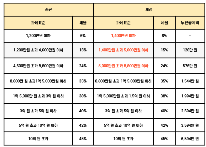 세율은 종전이랑 동일한데요 과세표준 금액이 달라져 그에 대한 누진공제액이 변동되었습니다.