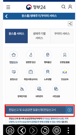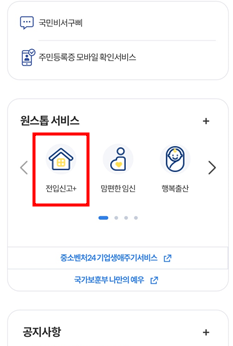 2. 페이지 중간쯤 원스톱 서비스에서 '전입신고' 클릭