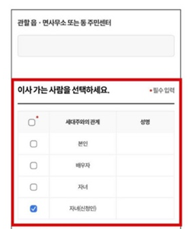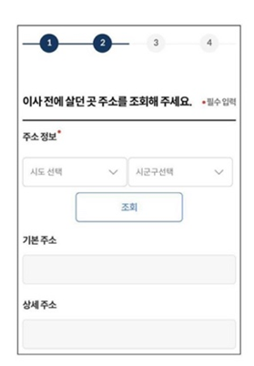 - 이사 전 주소를 입력하시고 해당 주소의 세대주/세대원 정보가 뜨면 이사 가는 사람을 선택해 주세요
