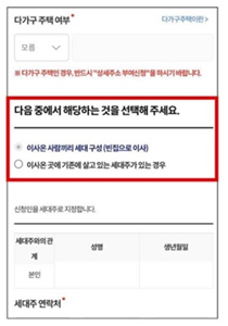 - 이사 전 주소를 입력하시고 해당 주소의 세대주/세대원 정보가 뜨면 이사 가는 사람을 선택해 주세요