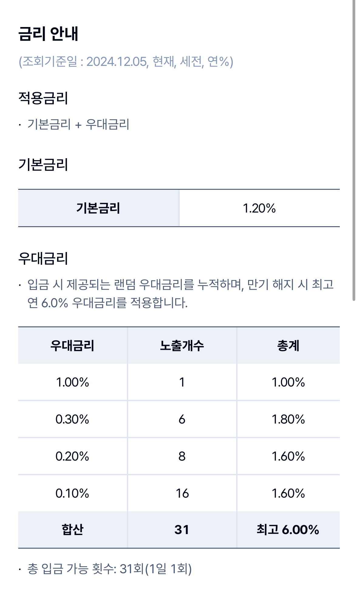 매일 적금넣어야하는 번거러움이 있어 재미삼아 한번 해보고싶다고하시는분들에게 적합한 적금인것네요.