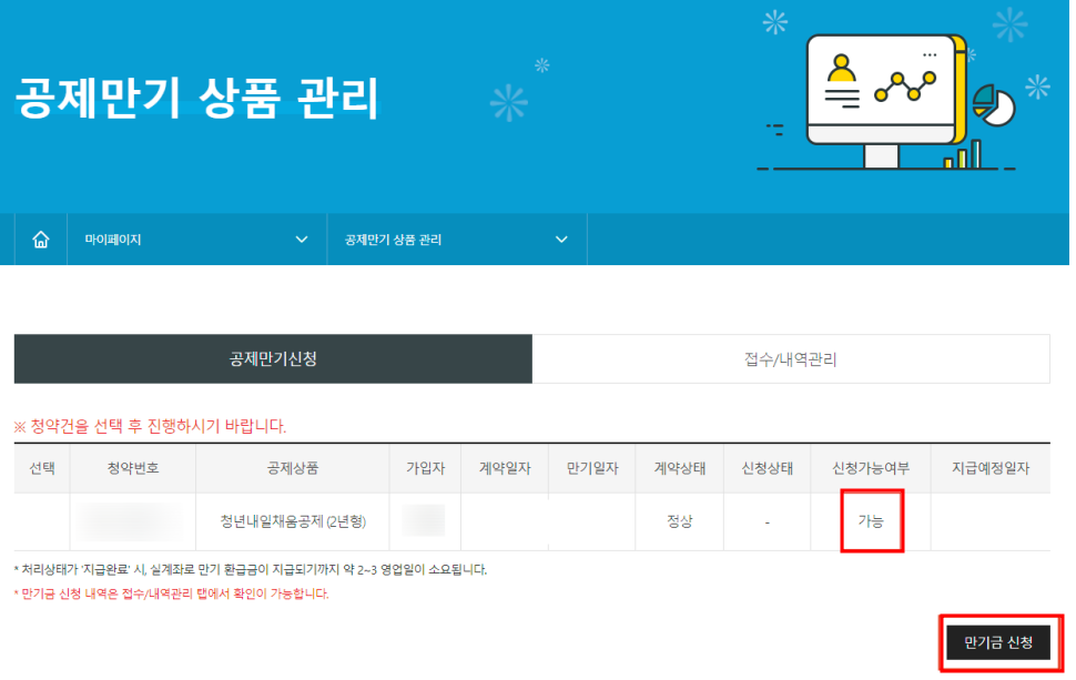 (3) 신청가능여부에 가능 확인하시 후 아래 하단 만기금 신청 클릭해주세요.
